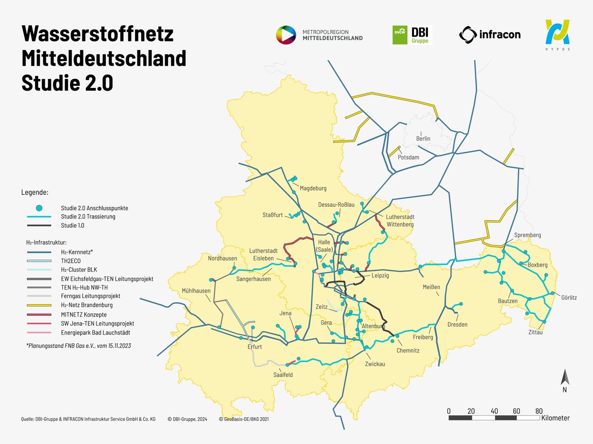Heute haben wir gemeinsam mit @HYPOS_GreenH2, @DBI_Gruppe und INFRACON die Pläne für das 1.100 km lange Wasserstoffnetz Mitteldeutschland vorgestellt. Die Studie wurde im Auftrag von 54 Partnern in Sachsen, Sachsen-Anhalt und Thüringen durchgeführt.